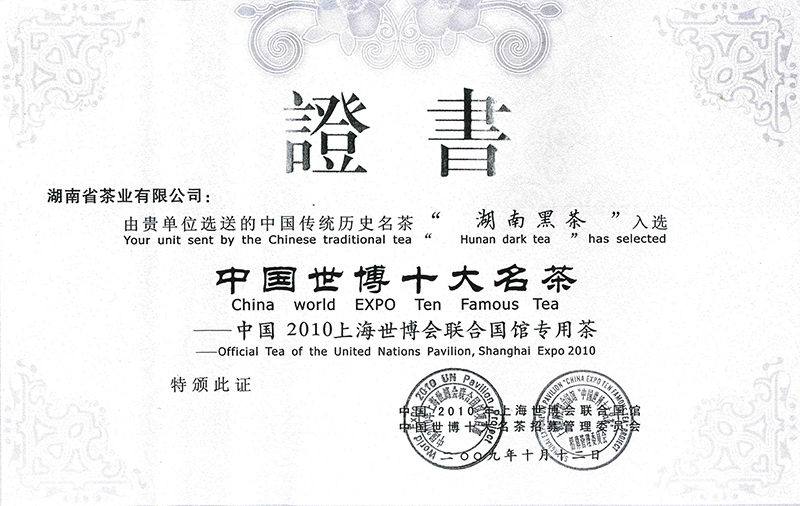 上海世博會(huì)中國(guó)世博十大名茶證書
