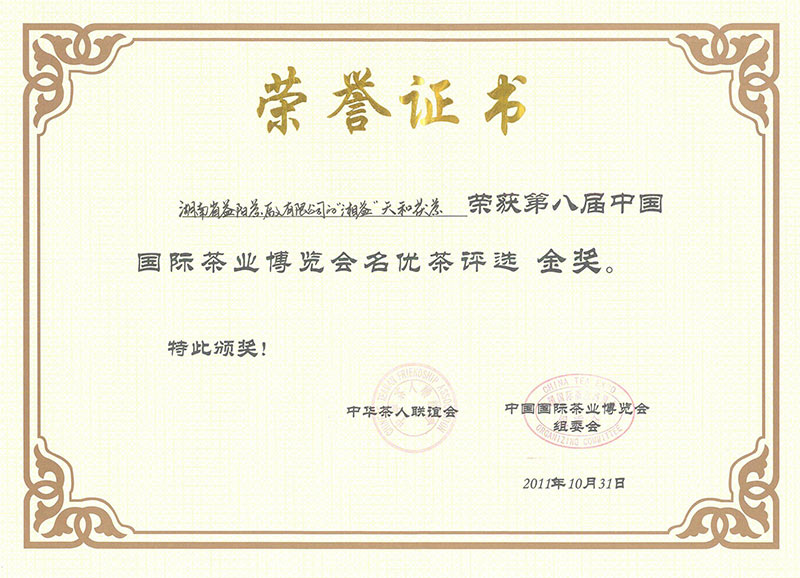 茯茶獲第八屆國(guó)際茶博會(huì)金獎(jiǎng)(天和)