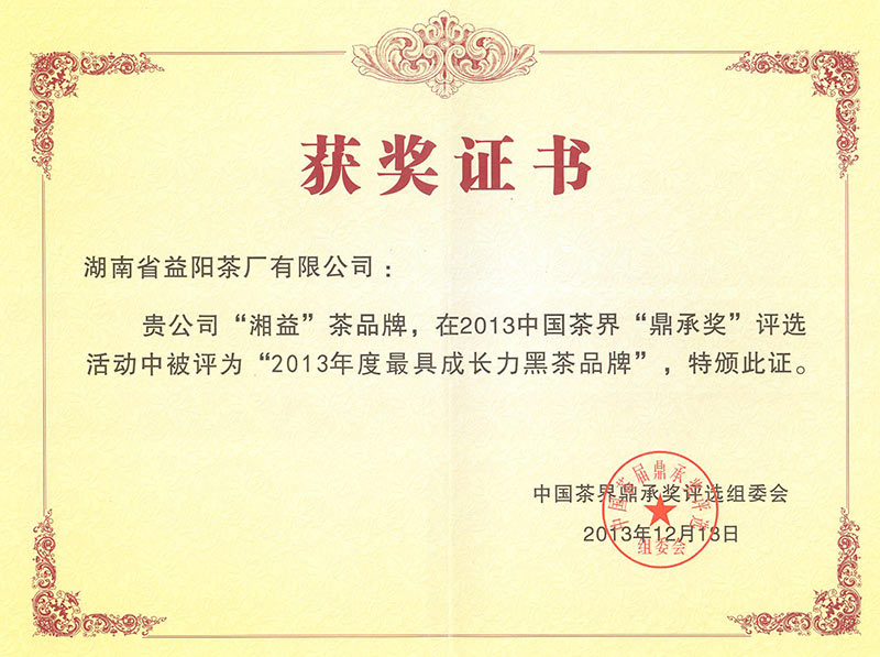 中國最具成長力黑茶品牌(鼎承獎(jiǎng))