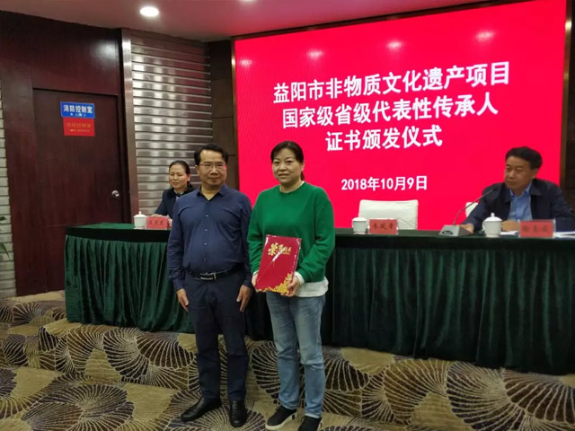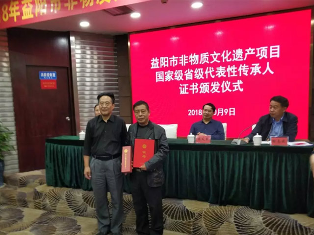 圖為湖南省文化廳非物質(zhì)文化遺產(chǎn)項(xiàng)目處竇雪松處長為劉杏益頒發(fā)證書