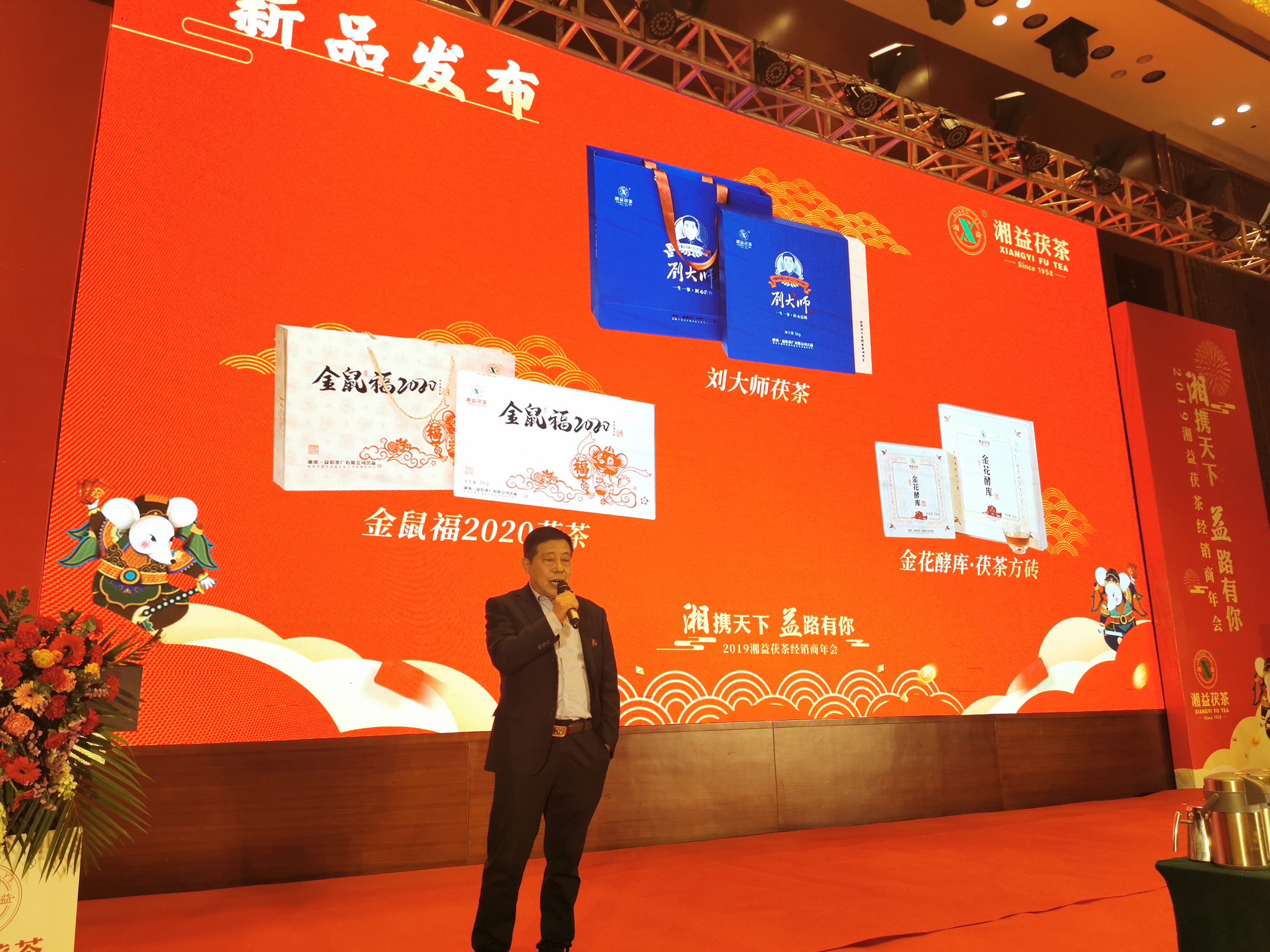 在下午的年會(huì)中,先是年度新品發(fā)布,由茯茶國家非遺制作技藝國家級(jí)傳承人、中國第一批制茶大師,公司副總經(jīng)理劉杏益大師做新品推介,有劉大師茯茶、金花酵庫方磚、金鼠福生肖茶、7319茯茶,這四款新品都傾注了湘益茶人的心血,得到了到場來賓的高度贊賞。