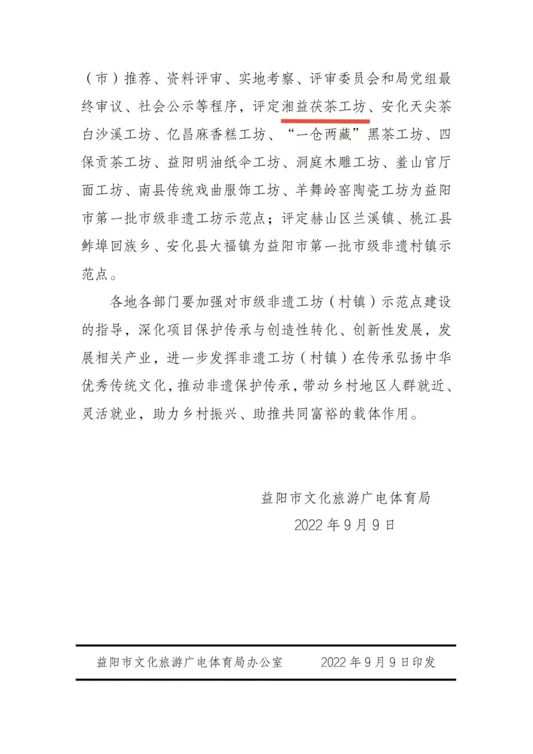 為深入貫徹中共中央辦公廳、國務(wù)院辦公廳《關(guān)于進(jìn)一步加強(qiáng)非物質(zhì)文化遺產(chǎn)保護(hù)工作的意見》有關(guān)精神,市文化旅游廣電體育局在全市開展非遺工坊、非遺村鎮(zhèn)、非遺街區(qū)示范點建設(shè)工作,經(jīng)區(qū)縣(市)推薦、資料評審、實地考察、評審委員會和局黨組最終審議、社會公示等程序,評定湘益茯茶工坊、安化天尖茶白沙溪工坊、億昌麻香糕工坊、“一倉兩藏”黑茶工坊、四保貢茶工坊、益陽明油紙傘工坊、洞庭木雕工坊、羞山官廳面工坊、南縣傳統(tǒng)戲曲服飾工坊、羊舞嶺窯陶瓷工坊為益陽市第一批市級非遺工坊示范點;評定赫山區(qū)蘭溪鎮(zhèn)、桃江縣鲊埠回族鄉(xiāng)、安化縣大福鎮(zhèn)為益陽市第一批市級非遺村鎮(zhèn)示范點。