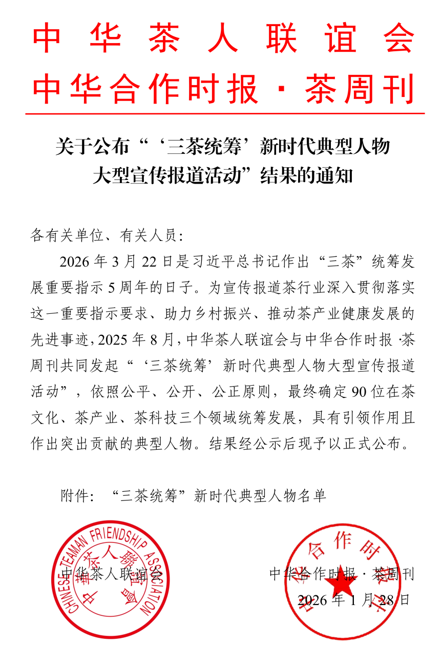 近日,由中華茶人聯(lián)誼會與中華合作時報·茶周刊共同主辦的 “‘三茶統(tǒng)籌’新時代典型人物大型宣傳報道活動” 評選結(jié)果正式揭曉。公司總經(jīng)理余智勇,憑借其在推動茯茶產(chǎn)業(yè)高質(zhì)量發(fā)展、深入踐行“三茶統(tǒng)籌”發(fā)展理念方面的突出貢獻,光榮入選。